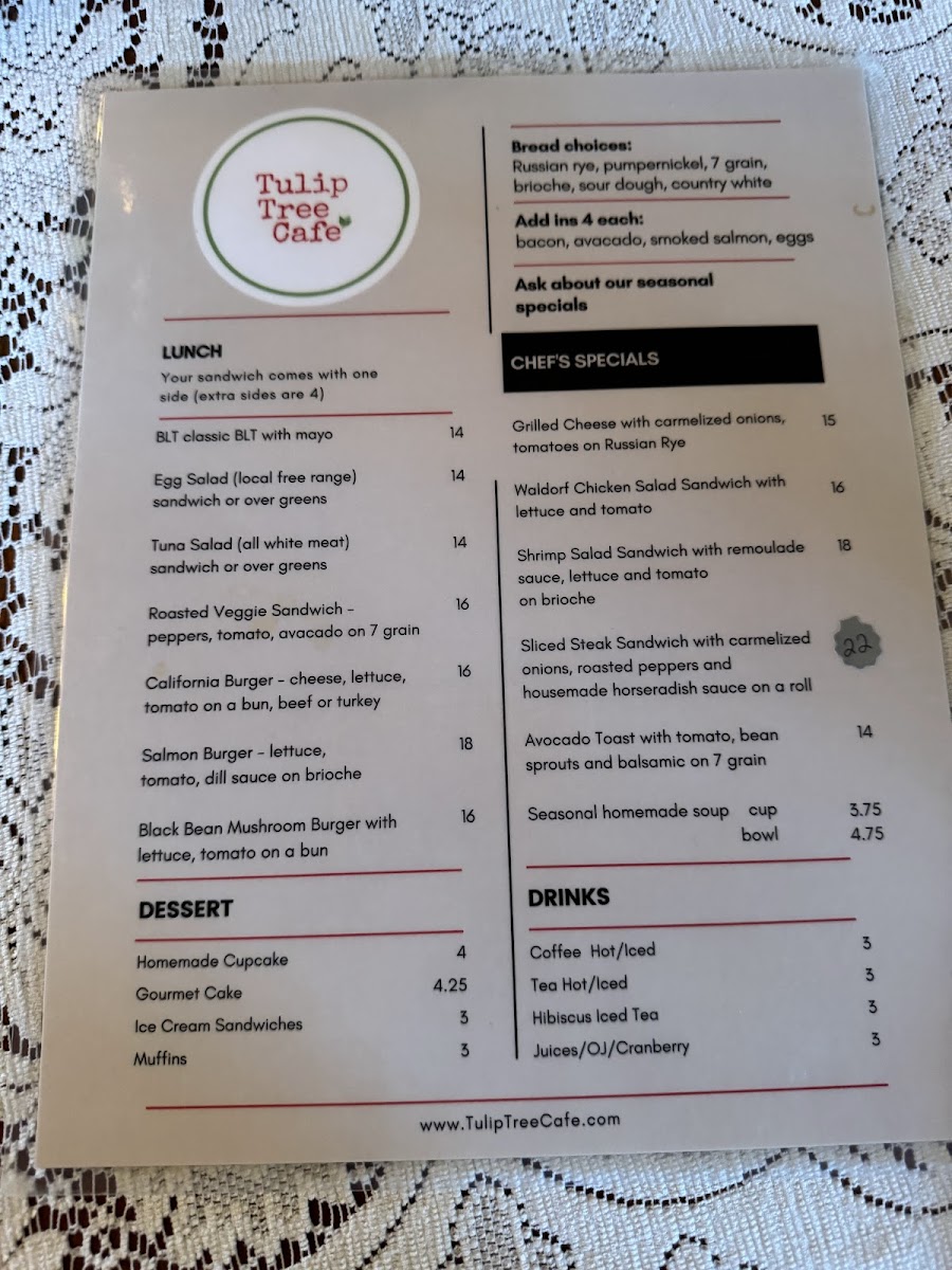 So, whether you're stopping in for a cozy breakfast, a peaceful lunch, or simply to enjoy a cup of coffee surrounded by nature, the Tulip Tree Cafe invites you to relax, unwind, and savor each moment. With its delightful dishes, beautiful setting, and genuine service, it's more than just a cafe—it's a place where memories are made and cherished.